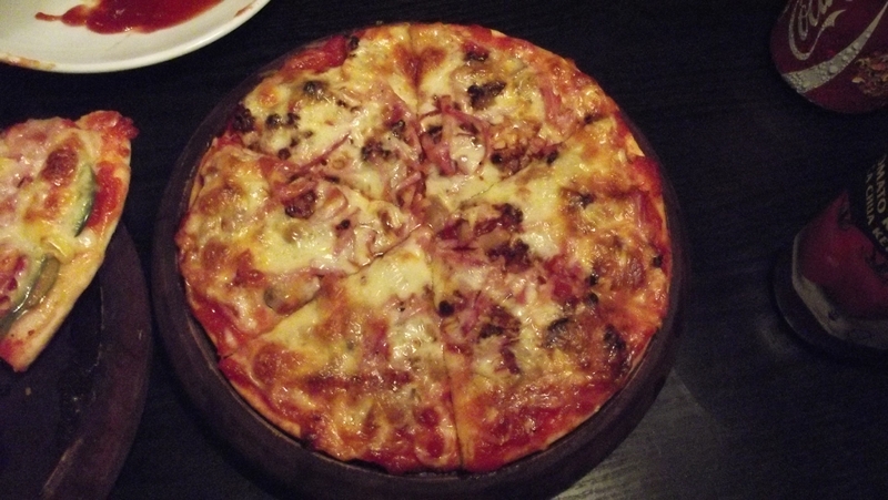 Mình chuyển sang làm pizza. Có công đoạn khó nhất là làm đế bánh thì mình mua sẵn rồi, nên chỉ việc đổ nhân lên rồi phủ phô mai quăng vào lò nướng, chờ nó thơm lừng rồi kêu beng một phát vang lừng là bỏ ra chiến được ngay. Cái món pizza này mình thấy khó nhất là làm thế nào để thái nhân (thịt xông khói, xúc xích…) được mỏng như ở ngoài hàng.