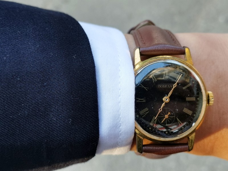 Vậy là sáng nay, mình đeo chiếc đồng hồ Liên Xô Pobeda lên cót tay, mặt màu gì đéo biết, cỡ hơi nhỏ so với tay mình. Chiếc đồng hồ này vốn được mua cỡ khoảng gần chục năm trước cùng với chiếc Raketa mặt kim nhũ, số dây leo. Chiếc Raketa đã được tặng cho người, giờ đã ở rất xa rồi. Chiếc Pobeda, vốn được cất kỹ, khi mình giở ra, thì đang dừng lại ở 5h30 từ bao giở bao giờ.
