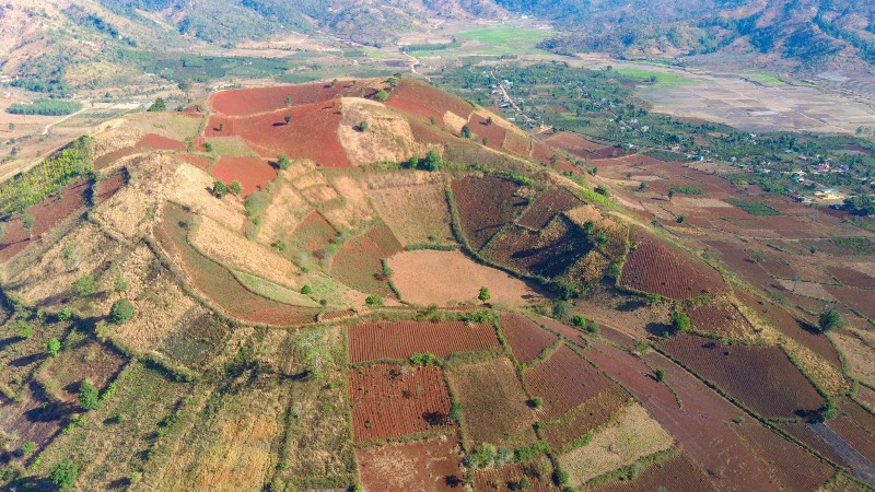 Đường lên núi cũng thoai thoải, dễ đi. Núi thấp lè tè chừng 200m so với mực đất bằng bên dưới thôi, còn độ cao xịn so với mực nước biển thì chịu vì ở đây xa biển quá, nhìn không thấy. Không hiểu sao đứng giữa miệng núi lửa đã tắt này, mình thấy thân thuộc và đồng cảm ghê gớm. Củ gừng dại năm xưa có cay mấy, thở ra khét, hét ra lửa mấy thì giờ cũng đằm lại, tĩnh lặng và hiền hòa ghê. Cái cảm giác yên bình thực ra không phải đến lúc trèo lên núi mới thấy, mà ngay từ khi phóng xe vào xã, rồi lượn một vòng trên con đường nhỏ bao quanh chân núi, mình đã thấy âm ỷ trong lòng rồi. Hóa ra nơi xưa kia là kinh hoàng chết chóc, giờ lại trở thành nguồn sống của cây cối hoa trái sắc màu.