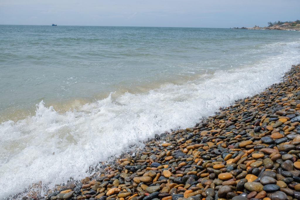 Biển Cổ Thạch là cái biển kỳ dị nhất trên đời, cả bờ biển dài hơn một cây số, không có hạt cát nào, chồng chất toàn đá đủ màu sắc, đủ loại vân hoa, viên nào to thì bằng cỡ nắm tay, mà nhỏ thì nhỏ hơn nắm tay. Sóng tung mình vào bờ sỏi đá nghe rào rào rào rào, xô đá dưới lăn lên, kéo đá trên lăn xuống lộc cà lộc cộc, không dữ dội nhưng cũng chẳng dịu êm, khác hoàn toàn với ấn tượng về bất cứ thể loại bãi biển nào khác ta từng đến trong đời.